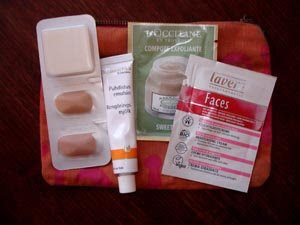 Testerit ovat erinomaisia myös matkustaessa. Suuntaan viikonlopuksi Turun ja Salon suuntaan superkevein kantamuksin ja osasyynä kevyeen laukkuuni on minimaalinen kosmetiikka-arsenaali. Kuvassa minikokoiset rasva, kuorinta, pesu- ja meikkivoide. Ainoastaan kasvovesi täytyy nyysiä siskolta. Kätsyä.