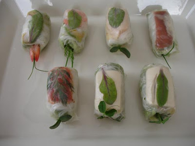 Ohuen riisipaperin sisään oli kääritty mm. lasinuudeleita, avocadoa, lohta, rapua, tofua, herneen versoja, salaatteja, kanaa ja tonnikalaa. Rullien maku on sushia huomattavasti miedompi, mutta ihana. Tuoreet raaka-aineet ovat näissäkin a ja o ja ne kandee syödä mahdollisimman pian tekemisen jälkeen. En vaan millään olisi raskinut popsia suihini näitä pieniä taideteokisa!