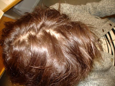 Olenko kaljuuntunut? Vaikea sanoa, mutta toisaalta, capillaarihoitojen myötä kuolleet hiukset kuulemma tippuvat, joten ehkä se sitten johtuu siitä… Harvoinpa sitä tulee valokuvattua omaa päälakeaan, onpas jotenkin inhottavan näköistä. Mutta kuten näette, ei ainakaan vielä ole nähtävissä juuri mitään muutosta. Aikaisintaan näenkin kuulemma merkkejä hoidon mahdollisesta tehosta kesällä.