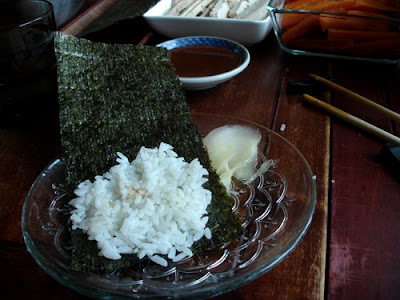 Idea on siis tämä: sushia helposti ja nopeasti, ilman sen kummempia kommervenkkejä ja hifistelyä. Sen sijaan, että rullattaisiin makirullia ja leikattaisiin ne kauniiksi suupaloiksi, jokainen rullaa oman pötkylänsä, täyttäen sen millä haluaa. Pötkylä dipataan soijaan ja that´s it. Superhelppoa.