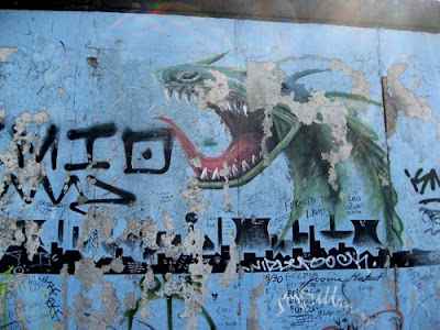 Nooran 12 syytä rakastua Berliiniin – videopäiväkirjapostauksen aiheena ovat tänään Berliinin graffitit ja katutaide. Huomaa muuten alapuolen kuvassa Berliinin muuri, eikö olekin yllättävän matala? Muurin hajoamisesta tulee ensi syksynä kuluneeksi tasan 20 vuotta.