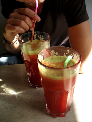 Kuvan juoma on siis suunniteltu krpulaiselle bilettäjälle, ja täytyy sanoa, että vihannes-hedelmä – combo on täydellinen! Smoothie oli valmistettu seuraavista raaka-aineista: omena, punajuuri, selleri, porkkana ja sitruuna. Ei ehkä kuulosta hirveän hyvältä, mutta maku oli kuin suoraan smoothietaivaasta!