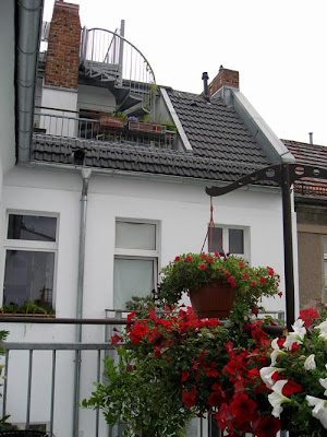 Kuten Olotilassa ihastelin, on Berliini harvinaisen vihreä miljoonakaupunki. Sen lisäksi, että partsit tursuavat kukkia ja kasveja, panin Berliinissä merkille, että moneen taloon on rakennettu ullakkohuoneistoja. Ainakin Prenzlauerbergissä monien vanhojen talojen ullakot ja katot on otettu hyötykäyttöön. Katsokaa nyt tätäkin.