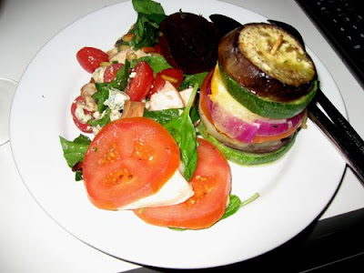 Ystäväni rakensi kasvistornin kesäkurpitsasta, sipulista, tomaatista ja munakoisosta, maustoi koko homman jotenkin (top secret) ja heitti systeemin uuniin. Keko pysyy koossa yksinkertaisesti hammastikulla.