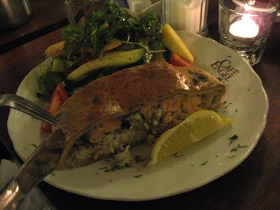 Lohipiirakkakaan ei kuulemma ollut pöllömmän makuinen kokemus. Olen silti itse sitä mieltä, että piiraita paremmalta maistuu anosten loistavasti marinoitu salaatti. Saisinkohan ensi kerralla tilattua pelkän lisukesalaatin? Siten annos olisi luonnollisesti myös terveellisempi.