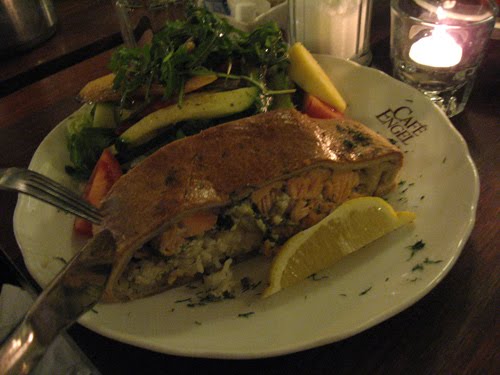 Lohipiirakkakaan ei kuulemma ollut pöllömmän makuinen kokemus. Olen silti itse sitä mieltä, että piiraita paremmalta maistuu anosten loistavasti marinoitu salaatti. Saisinkohan ensi kerralla tilattua pelkän lisukesalaatin? Siten annos olisi luonnollisesti myös terveellisempi.