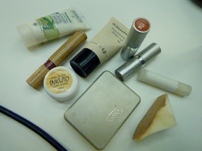 Meikatessani itseäni NYTin kuvaukseen oli pakko räpsäistä kuva meikkipussin sisällöstä, koska se alkaa jo aika vakuuttavasti koostua ihmis- ja ympäristöystävällisestä kosmetiikasta (pahoittelen ankean väristä kuvaa).