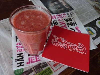 Adelin näyttelyavajaiskutsun vieressä komeilee muuten smoothie, jonka reseptin haluan jakaa. Tämän voi vaikka valmistaa sunnuntaina ystävänpäiväpuuron kaveriksi 🙂