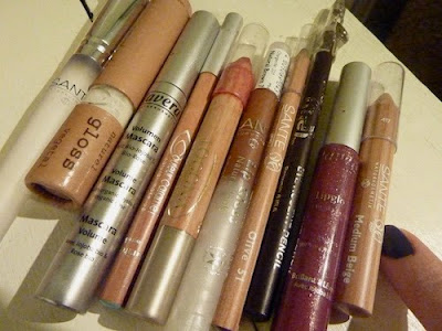 Minulle on kertynyt yllättävän monia meikkikyniä, vaikka käytän vain muutamaa (ja on siellä yksi ripsivärikin, näköjään). Nämä ovat lähinnä silmän- ja huultenrajauskyniä, ja kaikki ovat sertifioitua luonnonkosmetiikkaa. Valikoimassani on Laveraa, Santea ja Couleur Caramelia.