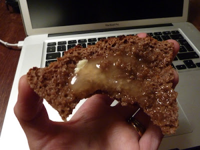 Hassua, en ole maininnut blogissani hunajaleipää. Syy on ainakin osittain se, että sen syöminen tapahtuu aina noin minuutissa, eikä ruokapostauksia ole kiva tehdä ilman kuvia. Ei tämäkään foto hääppöinen ole, mutta maku korvaa ulkonäön.