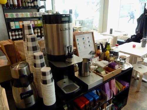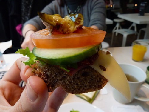 Sis. delin aamupala maksaa 9,50 ja sisältää tuoreita vihanneksia, hedelmiä, kananmunia, juustoa, leikkeleitä, teetä, mehuja, luomupannaria, hilloa, siemeniä, levitteitä, luonnonjogurttia, luomumysliä ja herkullisia, marinoituja vihanneksia. Huh. Tykkäsimme molemmat. Tästä tulee tapa.