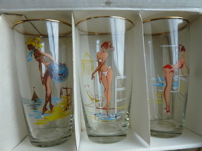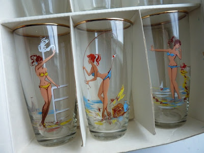 Lasit eivät ole snapsi-kokoiset, vaan ihan juomalasin mitan täyttävät. Kunhan kesäsiirtolamökki saadaan kesäkuntoon, taidan viedä juomalasit sinne. Näille bikinitytöille 50-luvulla rakennettu pikkumökkimme on täydellinen kotipaikka. Ja näistä laseista juodaan rakkaiden ystävien kanssa sangriaa!
