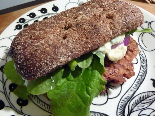 Nyt ruokahehkutusta: jos jollain vegesafkalla kannattaa aloittaa lihansyöjän käännyttäminen kasvissyöjäksi, on se vegeburgeri. Olen muistaakseni jakanut teille oman ruisburgerireseptini (vaikken sitä nyt blogista löydäkään?!), mutta tämä on vähintään sen veroinen.