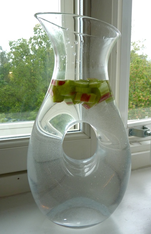 Tee siis näin: viipaloi raparperinvarsi ja heitä palaset vesikannuun. Pienikin määrä riittää. Lisää kannulliseen vettä pari desiä raparperien keitinlientä ja laita homma hetkeksi jääkaappiin. Maku on tosi raikas, eikä juoma kaipaa sokeria laisinkaan.