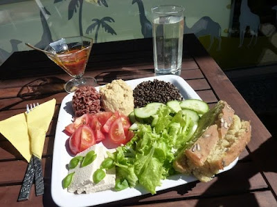 Se näyttää hyvältä, mutta maku valitettavasti puuttui. Lautasen vasemmassa yläkulmassa on riisiä, keskellä kikhernemuhjua (se oli ihan jees) ja oikealla linssejä (ei mitään makua). Salaatti, kurkku ja tomaatti maistuivat tuoreelle ja hyvälle, mutta tofu (lautasen vasen alareuna) oli ihan kamalaa. Luulen, että se oli jopa vanhaa. Leipä näytti hyvälle, mutta koska en syö vehnä-hiiva -cocktailia, en voi antaa makuarviota.