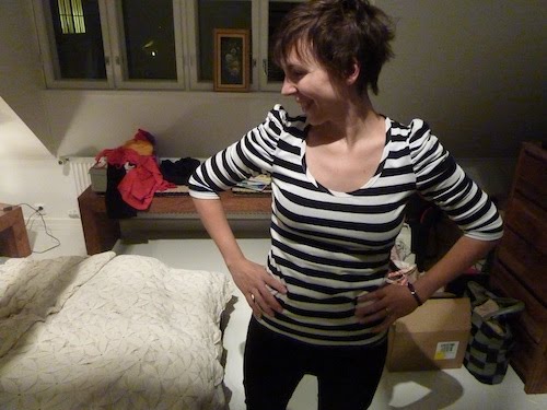 Otin monta hienoa kuvaa, joissa ei näy uuden kotimme muuttokaaos, mutta tämä räpsy, jossa pieni tyttöni nauratti minua sängyllä jokellellen oli sekä fiilikseltään, että paidan hahmottamismielessä paras, sori vaan siis taustan sekamelska. Tällaista täällä vielä on.
