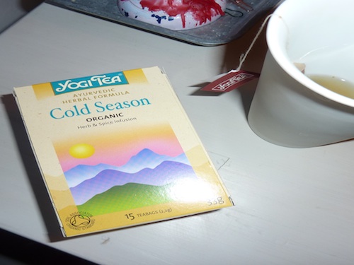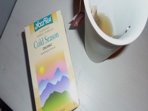 Jos joku muu siellä kärvistelee samankaltaisissa olotiloissa, suosittelen testaamaan Yogi Tean Cold Seasonia. Inkivääri, sitruuna, lakritsijuuri, lime, eukalyptus, kardemumma, sitruunaruoho, mustapippuri, basilika, appelsiininkuori, persilja, piparminttu, lehtisellerin siemenet, mausteneilikka, mäkimeirami, siankärsämö ja kaneli(!) ovat herkullinen ja lämmittävä cocktail, joka maistuu flunssaisen suuhun ah niin täydelliseltä. Sekaan tuoreen sitruunan mehua, Echinaforce-tippoja ja hunajaa. Muista kuitenkin nauttia hunajaa myös pelkältään, jotta hyödyt parhaiten sen terveysvaikutuksista.