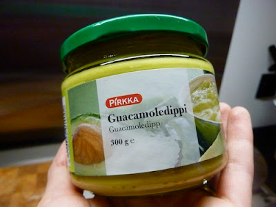 Jostain ihmeen syystä, myös tätä alemman kuvan muoviliman näköistä lillua, jossa on huimat 0,7% avokadojauhetta, kutsutaan guacamoleksi. Tai siis guacamoledipiksi. Mönjän on nimennyt Pirkka (jota juuri pääsin kehumasta).