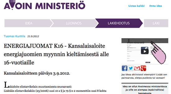 Minulle on aivan sama, jos joku aikuinen haluaa tällaisella litkulla itsensä tiloihin, mutta ei näitä alaikäisille pitäisi myydä. Siksi onkin tärkeää, että te kaikki samaa mieltä kanssani olevat allekirjoitatte kansalaisaloitteen, jossa energiajuomien alaikärajaksi vaaditaan 16-vuotta. Mun puolesta se saisi olla 18.