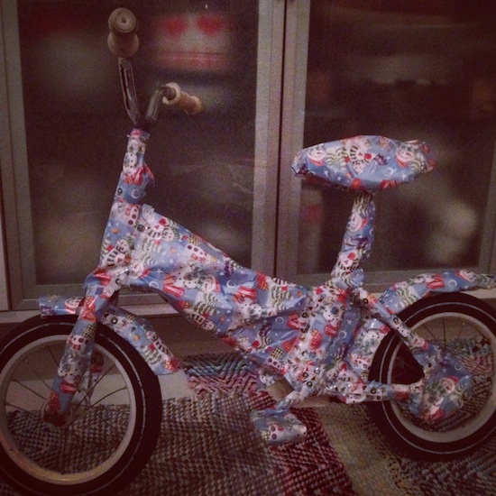 Lahjaksi valmistin tänä vuonna hitiksi muodostunutta pähkinä-siemen-chili-hunaja -herkkucocktailia sekä kahta eri mysliä. Ekan reseptin jo saittekin, lumimyslin reseptin laitan teille piakkoin. Isla sai pukilta tattijakkaran lisäksi fillarin, jonka paketoiminen oli aikamoinen sessio…