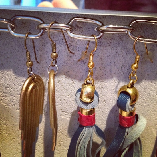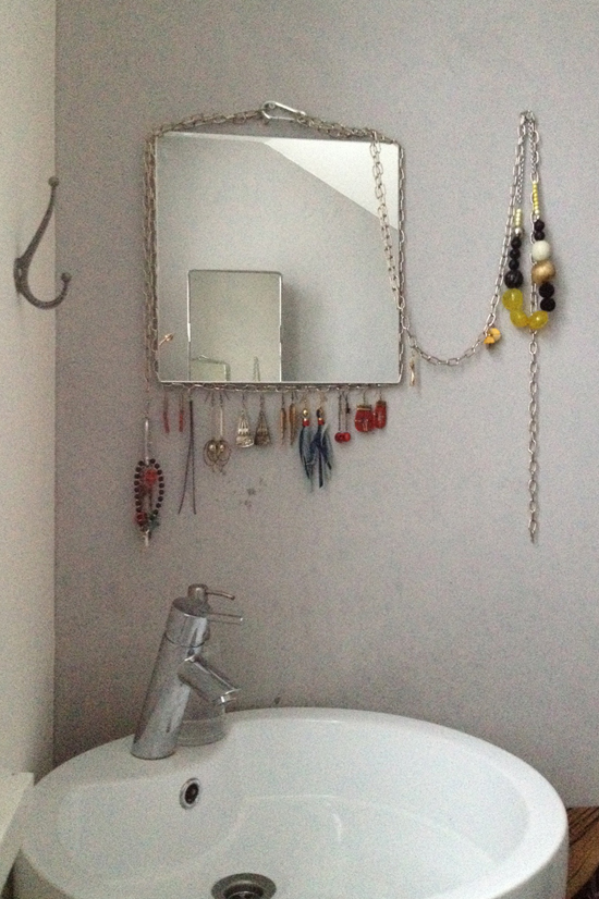Lauantaiaamuna kasvoja pestessä hoksasin, että korvakorut saisi kätevästi roikkumaan peilin kettingistä. Yhtä kätevä kuin äidin virkkuukoukkusysteemi! Plus että nyt korut ovat näkyvillä. Minusta on aina niin sääli, että kauniit vaatteet ja asusteet säilytetään jossain kaapin kätköissä, kun ne voisivat ilahduttaa näkyvillä päivittäin.