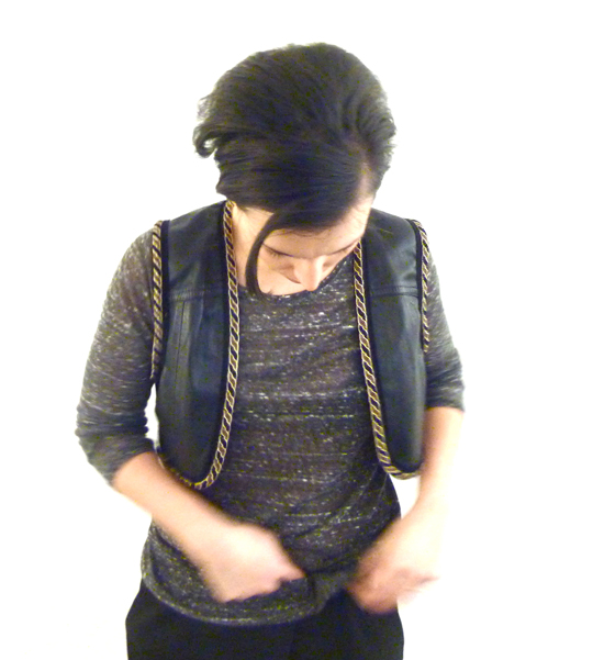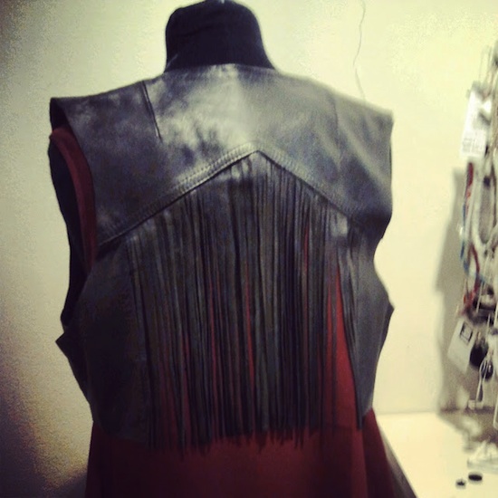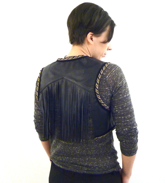 Näet kuvat alkuperäisestä rotsista täällä (Ötökkälaukku-postauksen lopussa). Travolta-liepeet saivat lähteä, samoin hihat, ja vuorikin. Jäljelle jääneelle asialle halusin hapsut ja pituudesta tippui puolet. Yhtäkkiä nahkarotsi näytti tältä: