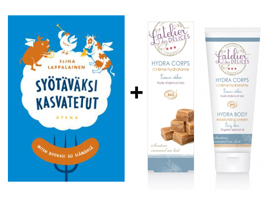 Mutta nyt: sen kunniaksi, että olette jaksaneet roikkua menossa mukana, haluan lähettää edes yhdelle teistä kiitokseksi lahjan. Kempparin 5-vuotissynttäreiden kunniaksi joku teistä saa omakseen Tieto-Finlandian voittaneen, Elina Lappalaisen Syötäväksi kasvatetut ja Látélier des Délices lempparivartalovoiteeni. Olisipa mulle lahja teille kaikille… Mutta mistäs taikoisin 25 000 pakettia? Lupaan kuitenkin järkätä tänä keväänä bileet, ja sinne saatte kutsun kaikki. Katsotaan sitten moniko ilmoittautuu ja tarvitaanko me paikaksi Silvoplee vai Hartwall Areena.