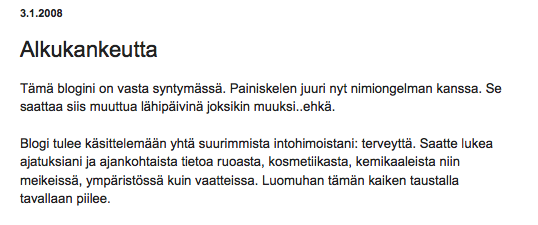 Lukaisin läpi vanhan blogini ekat tekstit ja siellä on kaikki vatsavaivoista luomuranskalaisiin, kosmetiikan salakielestä antimainontaan, lisäaineahdistusta, Berliinin ihailua ja luonnonkosmetiikan löytämistä. Että enpäs kyllä ole viidessä vuodessa pitkälle päässyt aiheistani. No, kirjoitustyyli sentään on vähän hioutunut. En silti ole sensuroinut mitään vanhoja tekstejä ja tiedoksenne, että siellä on paljon hyvää ja ajankohtaista asiaa, kandee lukea mikäli kiinnostaa. Kemikaalicocktail.blogspot.fi siis.