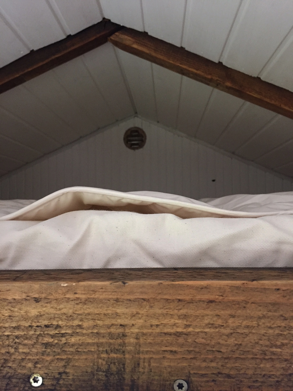 Porin Villa & Peitteen futoni on tarpeeksi jämäkkä nukkumiseen, mutta tarpeeksi pehmeä, jotta sen sai yksin nostetuksi ja ängetyksi paikoilleen. Jos kyseessä olisi ollut massiivisempi patja, en ikimaailmassa olisi saanut sitä operoitua parvelle.