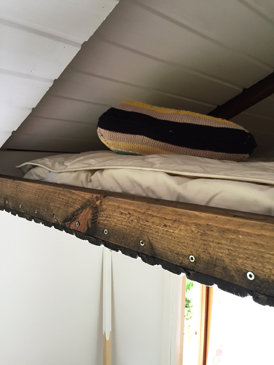 Olen jo muutaman vuoden ajan vaihtanut perheen vuodevaatteita ja patjoja vähitellen luonnonmateriaaleista valmistettuihin, joten oli aika selvää, että tilaan Porin Villa & Peitteestä patjan myös mökin parvelle. Haasteena oli parven matala reuna (5 cm), jonka yli en halunnut, että patja mielellään näkyisi. Villa & Peitteen Teija Viinikka suositteli parven patjaksi puuvillatäytteistä futon-patjaa sekä petaria. Patjan leveydeksi määrittelin 156 cm, muutamaa senttiä vaille parven koko leveyden. Mittatilauksena kun voi tilata, saa just sitä mille on tarve. Huippua! Kuten kuvasta näkyy, tulee patja kyllä parven reunaa korkeammalle, mutta ei se niin haittaa.