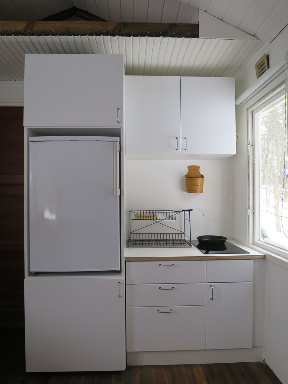 Mökissä ei ole ollut vuosiin jääkaappia. Sen vuoksi siellä operoiminen on ollut lasten kanssa vähän haastavaa, eikä Pikkumökissä olekaan yövytty vuosikausiin. Nyt on vihdoinkin taas toimiva keittiö (ja nukkumapaikkojakin tarpeeksi). Kuinka odotankaan ensi kesää!