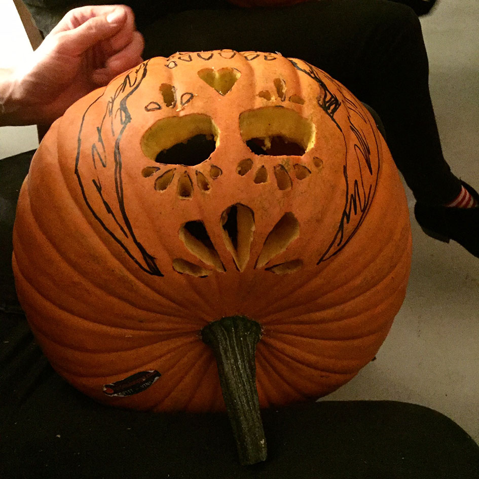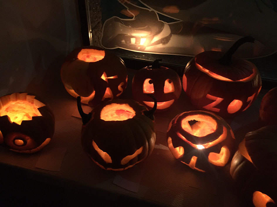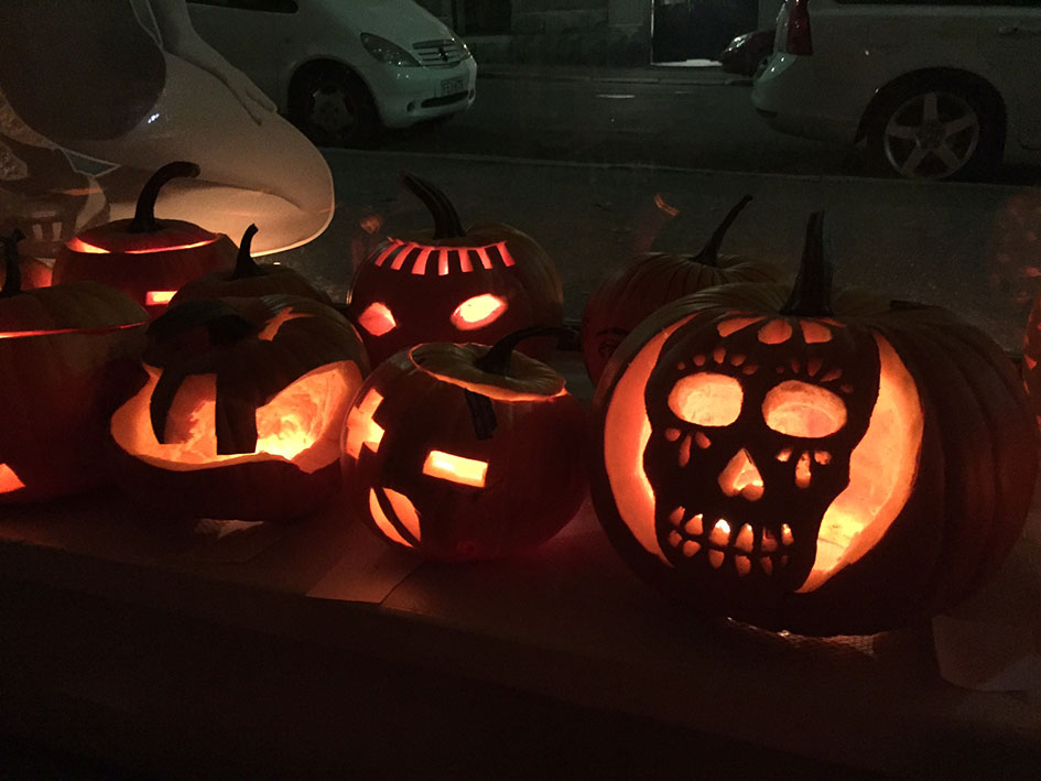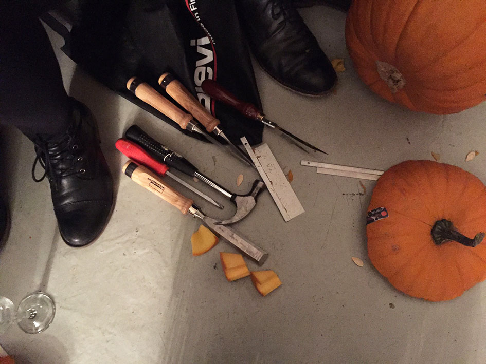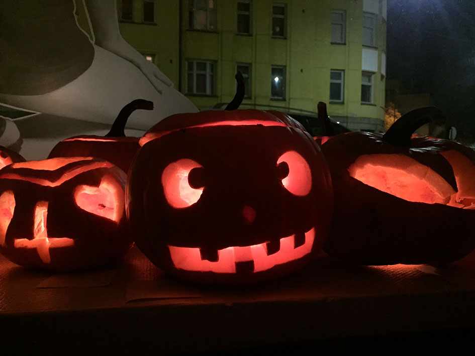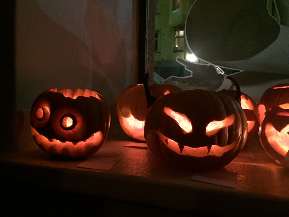 Kun meneillään on vuoden pimein ja ankein aika — okei OLI, ennen kuin lumet tänään laskeutuivat katuja valaisemaan — ei mielestäni tarvita kummoista syytä juhlimiseen. Ihan vaan vaikka ELÄMÄ itsessään on hyvä syy. Aikaisemmin syksyllä kuitenkin kalenteriin bileille paikkaa hakiessani kelasin, että ehkä voisimme tänä vuonna kaivertaa kaveriporukalla kurpitsalyhtyjä, joten ajoitin ystävien koolle kutsumisen Halloweenin aikaan. Viime lauantaina varmasti ihan jokainen ohikulkija havaitsi, mitä Flemari 2:ssa on meneillään.