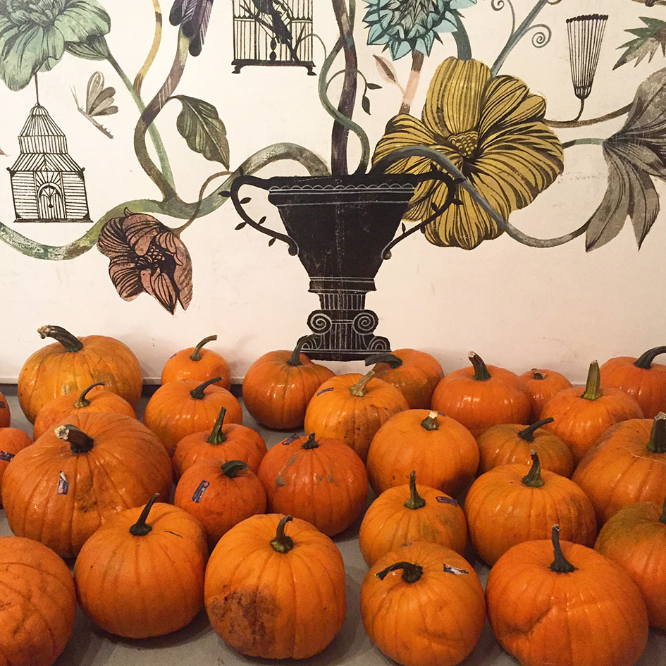 Tänä vuonna ei tehty kurpitsalyhtyjä ihan pikkujengillä: meitä oli yli 30. Perjantaina odottelin työhuoneella kurpitsalähetystä, kun Kurpitsakaupan Katariina kurvasi tihkusateessa lava-autolla ikkunani eteen. Tarkalleen 33 kurpitsaa roudattiin työhuoneen aulan lattialle ja voi kuinka suloisia ne olivatkaan. Pikkutyypit. Nauratti vaan niitä katsoessa.