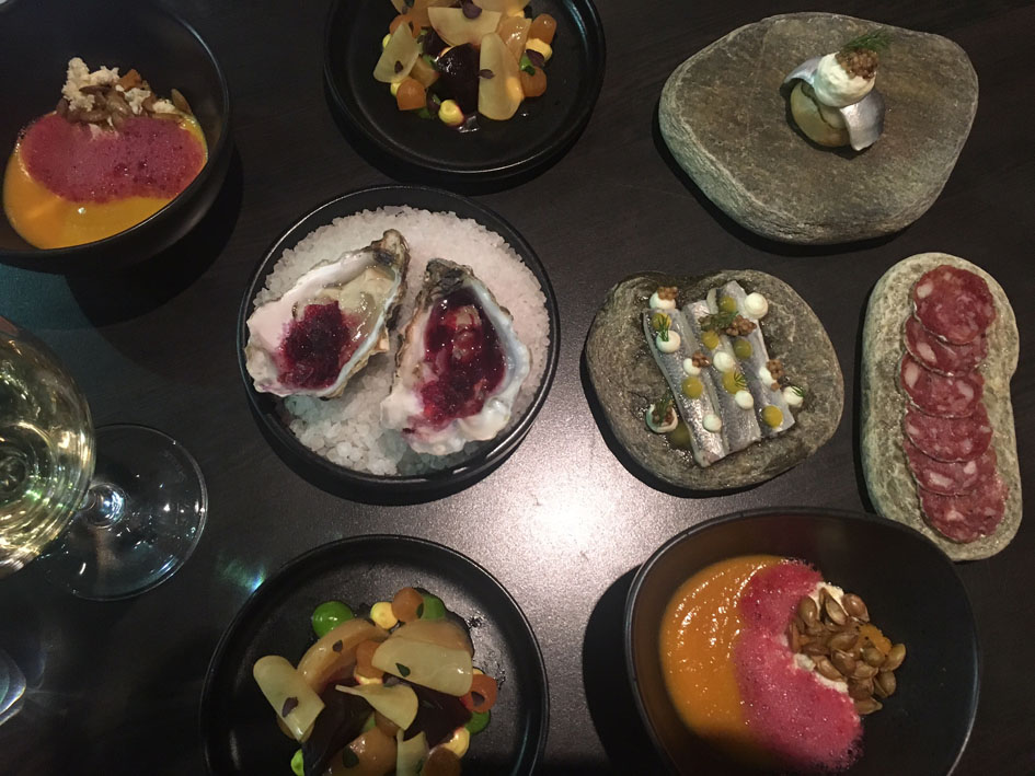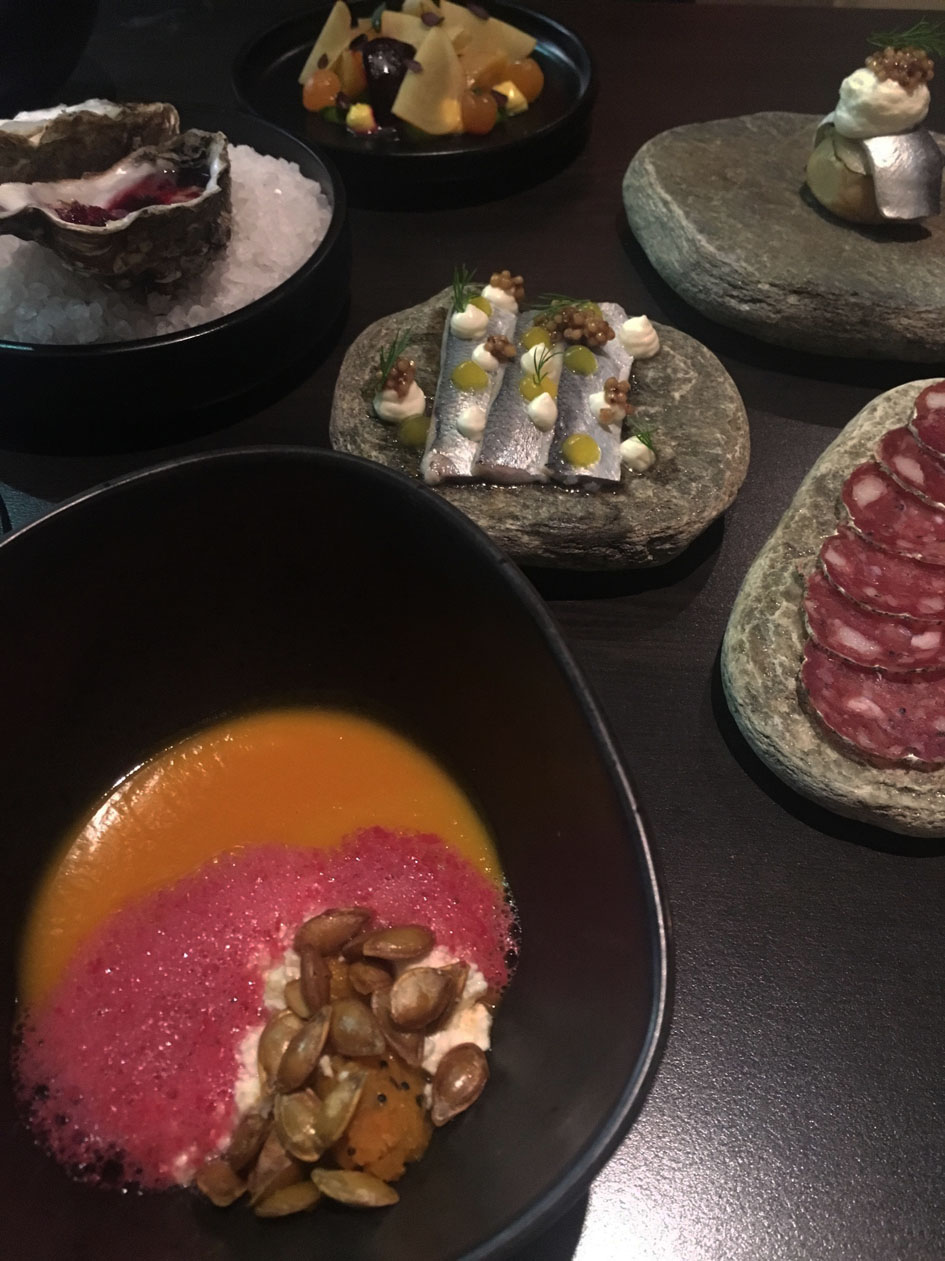 Saimme seuraavaksi monta pikkuannosta: ihanan freesiä ja maukasta keltajuurisalaattia sekä nautinnollista kurpitsakeittoa fetalla, jossa oli ihana takapotku. Tämänkin olisin helposti voinut nauttia pääruokana. Osterit eivät herättäneet kummassakaan fiiliksiä (me vaan ei olla osterityyppejä kumpikaan), mutta silakka piparjuuricremellä oli maukasta, samoin Pariisin kuulemma parhaasta makkarakaupasta peräisin oleva ”Pork Noir”.