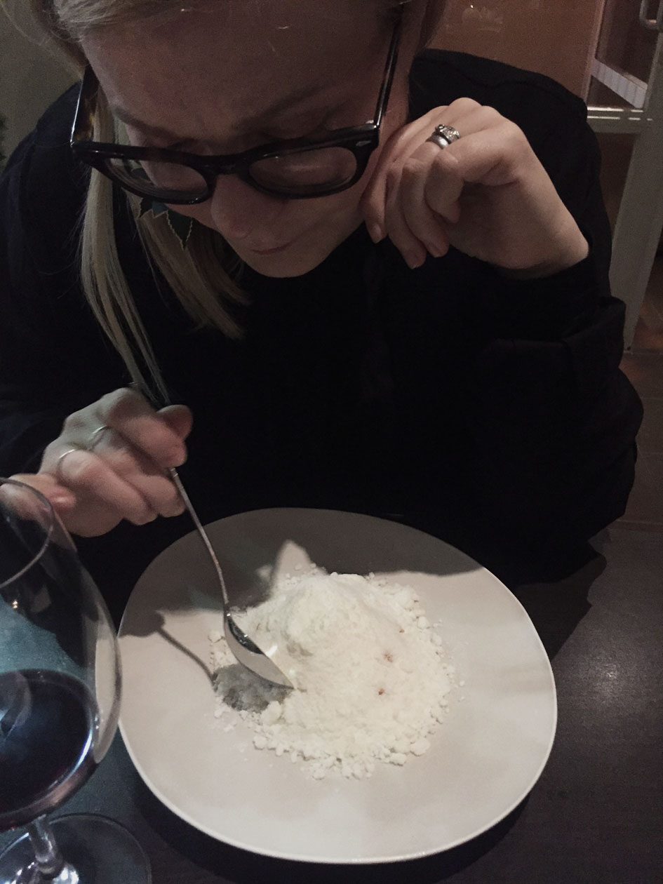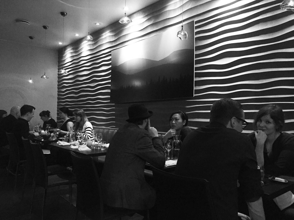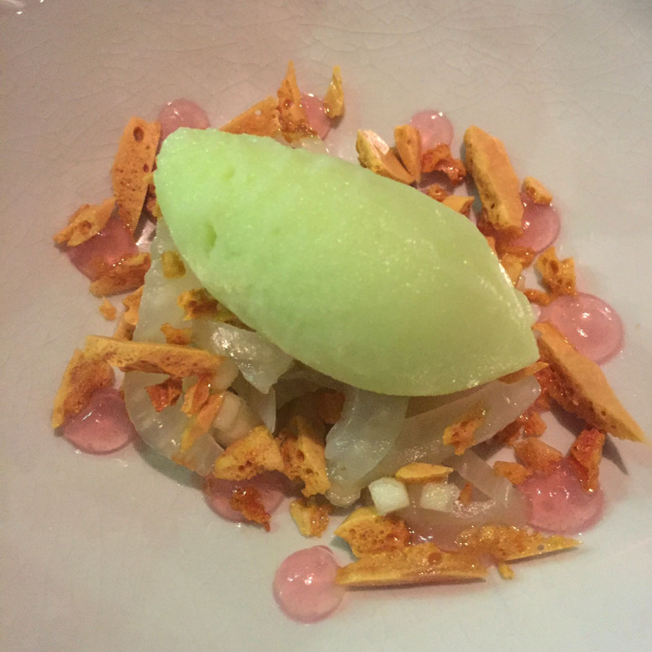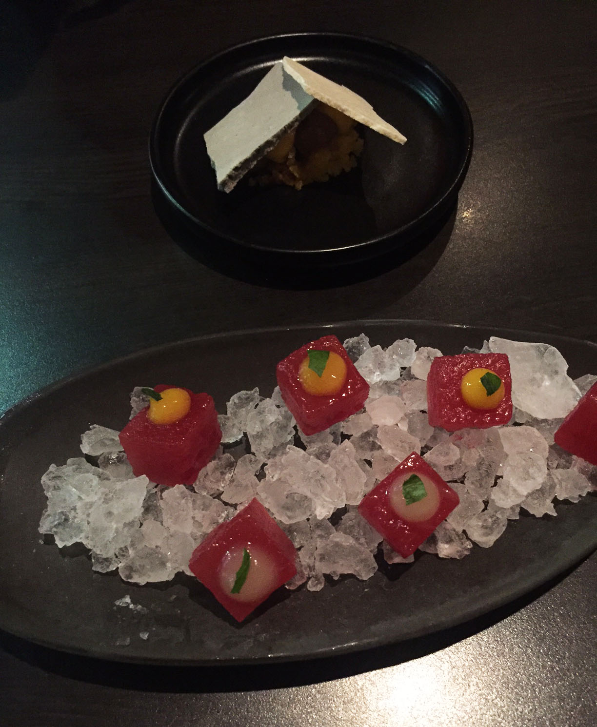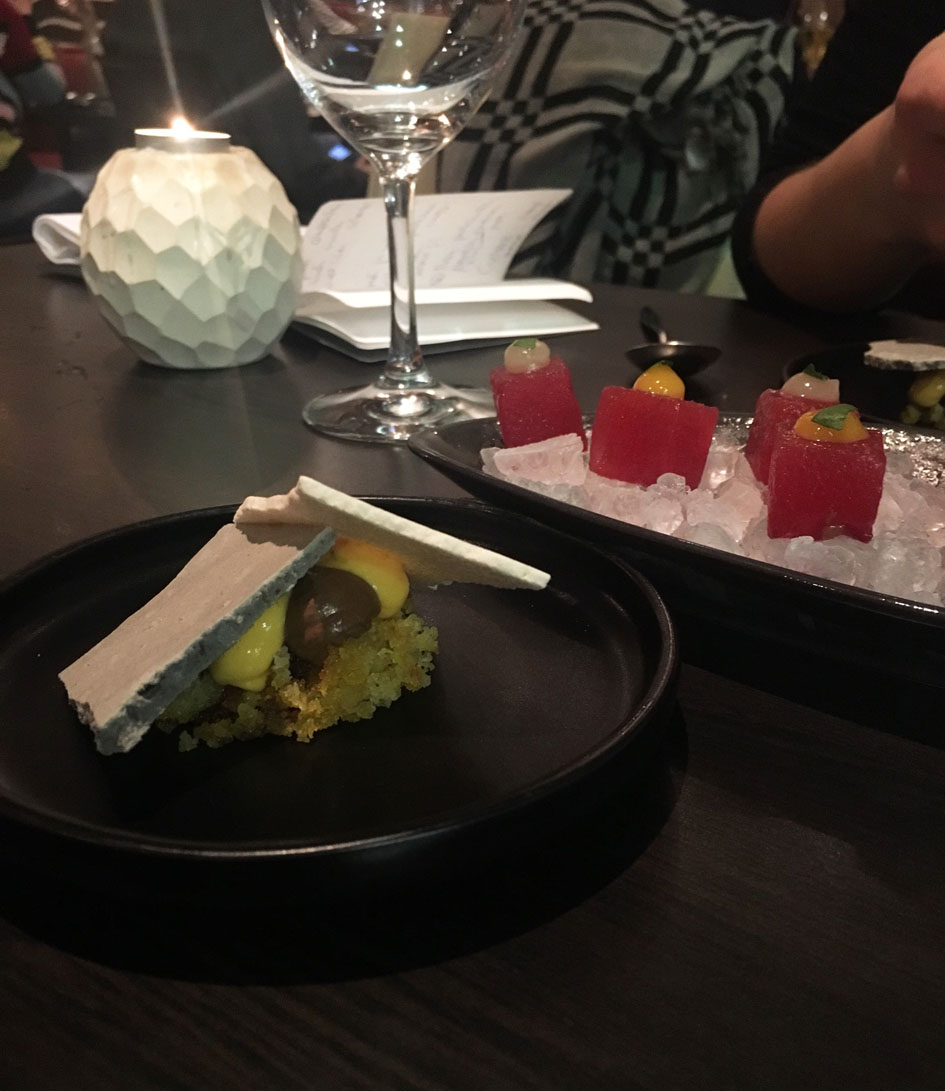 Kaikista yllättävimmät maut ja ruokakonseptit koimme  jälkiruokien ilmestyessä eteemme: sormin syötävä sangria, joka oli imeytetty vesimelonikuutioihin, tyrniä, lakritsaa ja marenkia — tässä kohtaa oli järjenlähtö lähellä — sekä suussa paukkuvaa vodkaa: vodkaa kuivatussa muodossa, limellä maustettuna ja paukkusokerilla höystettynä. Tajutonta!