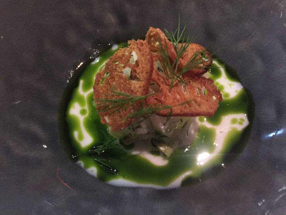 Sellerisorbetti-annos oli jotain ihan sanoinkuvaamatonta: ensinnäkin, kuka koskaan yhdistäisi sellerin ja sorbetin? Toisekseen: kuka yhdistäisi tähän jälkkäriin fenkolia? Aivan uskomattoman hyvää; sellerisorbetti fenkoli-omenasalaatin kera. Jos jotain Naturassa syöt, ota se piimäsiika ja tämä.