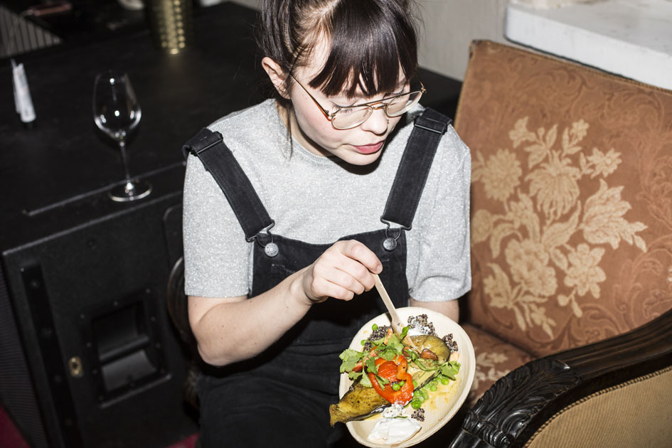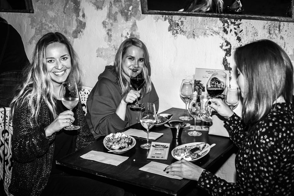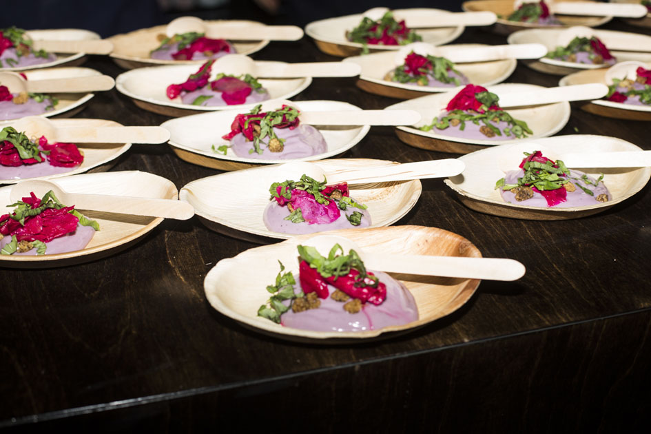 Päivän toinen tilaisuus järjestettiin blogini lukijoille ja kollegabloggaajille. Olin kutsunut paikalle bloggaajia, joiden työtä itse arvostan ja jotka tekevät omalla tontillaan sellaista, mistä sietää olla hiton ylpeä. Lotten kanssa kerroimme Mádara-yhteistyöstämme, mutta varsinaisesti ideana oli tavata jengiä ja nauttia Sami Tallbergin meille suunnittelema vegaanimenu. Mies on kyllä hillitön visionääri: pääruokana oli grillattu munakoiso, joka syötiin kaapimalla liha irti munakoison kuoresta. En ole koskaan tullut edes ajateleeksi, että munakoison voisi valmistaa näin. Koisoa maustoi mm. curry, sahrami, inkivääri, korianteri ja Oatlyn iMat Fraiche. Niin herkullista!