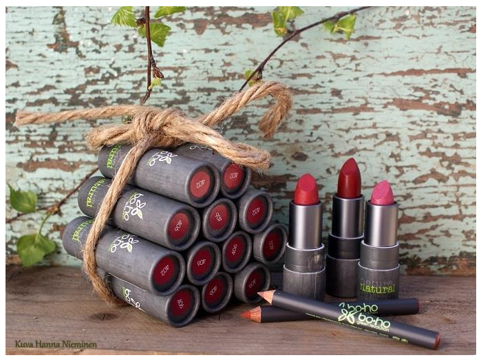 Myös Natrue-sertifioidulla Laveralla on herkullisen väristä huulikosmetiikkaa ja huokeita hintoja. Kuvan Delicious Peach -huulikiille maksaa Ruohiksessa vähän päälle kympin. Sarjan huulipunat ovat reilut 13 euroa. Boho-sarjan huulipunat ovat Laveran kanssa samaa hintaluokkaa ja sävyjä on monia. Hyvinvoinnin tavaratalossa Boho-punat maksavat 11,50 €*. Bohossa itseäni ihastuttavat osittaiset pahvipakkaukset. Tuotteet ovat niiden ansiosta tosi kevyitä kantaa mukana.