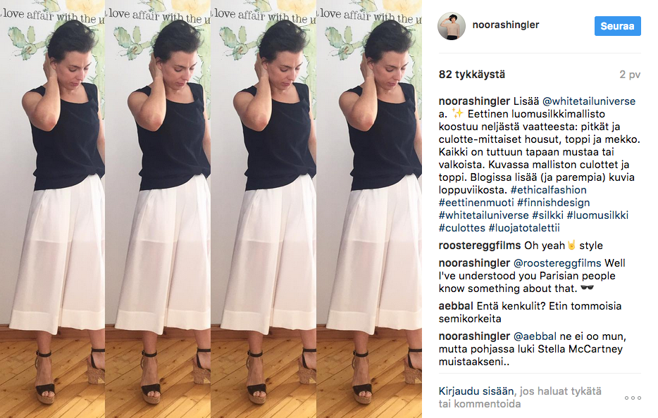 Ilouutisia kaikille, jotka innostuitte maaliskuussa esittelemästäni Whitetail-brändistä. Mallisto on nyt täydentynyt luomusilkkivaatteilla*, jotka tekivät itseeni paljon isomman vaikutuksen kuin olin kuvitellut. Kävin Margitin luona testaamassa kaikki neljä uutta Whitetail-silkkivaatetta, joista laitoinkin jo maistiaisia Insta-tililleni.
