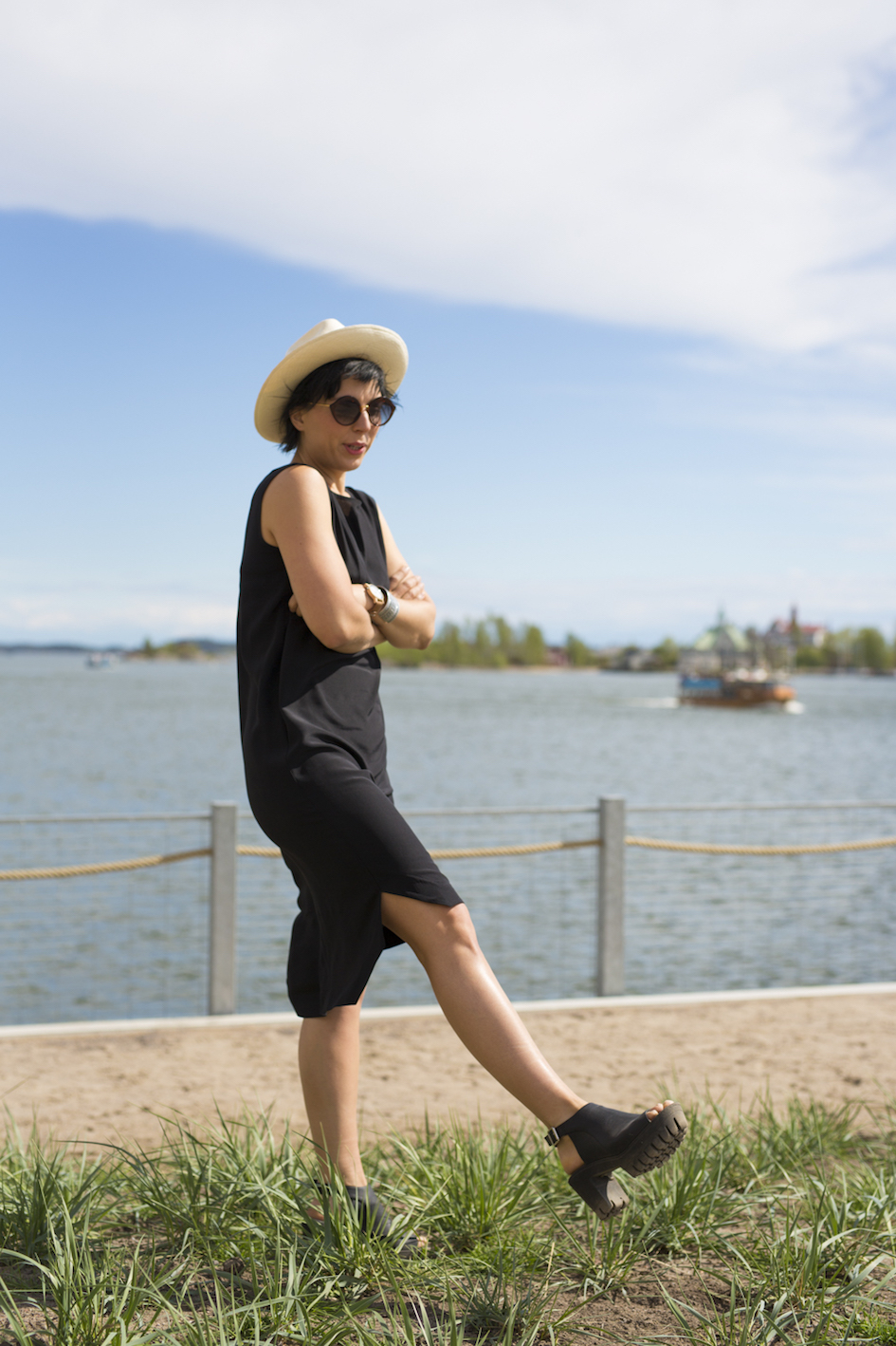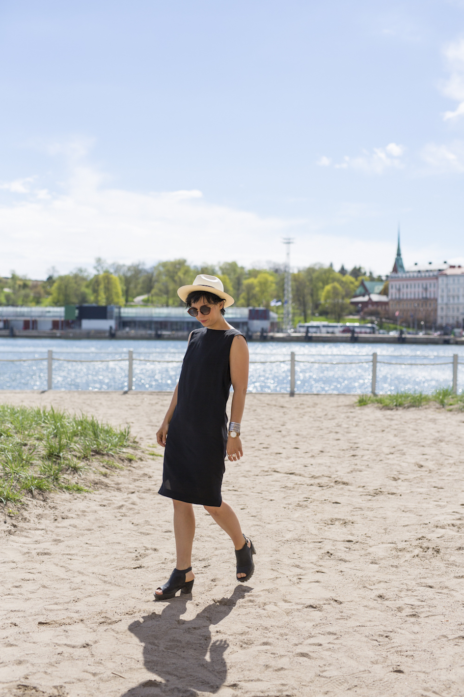 Ehkä helpoin ja mukavin asukokonaisuus ikinä: toimii kaikkialla bileistä hautajaisiin ja arkitilanteista hyvinkin juhlaviin tilaisuuksiin. Vakavampaan tai lennokkaaseen meininkiin. Kävellessäni kuvauksista kotiin sain paljon huomiota osakseni näissä mustissa liehulahkeissa, hatussa ja aurinkolaseissa. Päätin ottaa katseet kohteliaisuutena, haha.