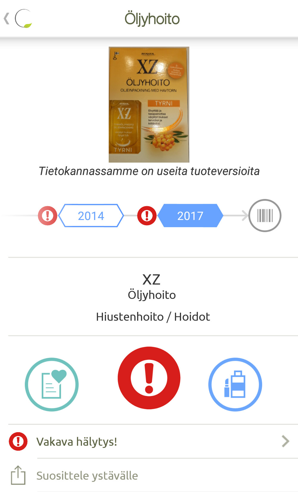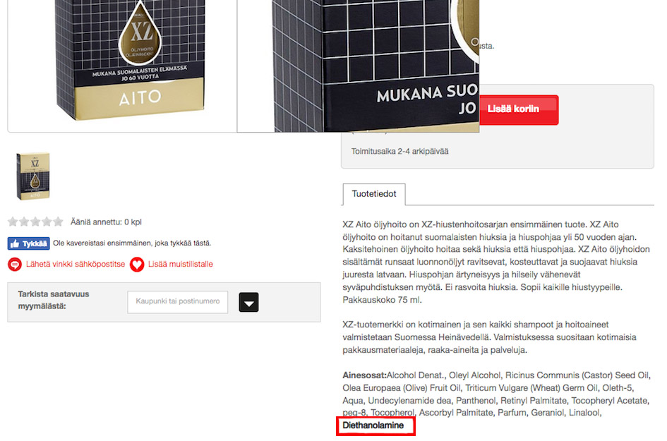Sain viikolla kunnian olla lukiolaisten haastateltavana, kun Helsingin Yliopiston järjestämä Globaalit haasteet -kurssi teki vierailun työhuoneelleni. Keskustelimme myös CosmEthics-appista, ja eräs ryhmän vetäjistä kertoi sovelluken hälyttäneen kotimaisen XZ-merkin tyrniöljyhiushoidon kohdalla, ilmoittaen laittomasta kemikaalista. Kyseessä on INCI-nimeltään Diethanolamine, kemikaali löytyy myös XZ-sarjan toisenkin öljyhoidon INCIstä.