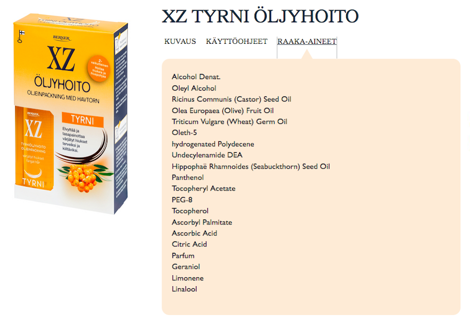 Kurkkasin XZ:n sivuille ja huomasin, että öljyhoitojen INCI on valmistajan sivuilla eri, kuin lukiolaisryhmää luotsaavan ohjaajan omistamissa tuotteissa. Tuotesisältöä on siis hiljattain muutettu, oletin. Mutta tilanne onkin toinen: aivan kuten Maybellinen puuterissa vuosi takaperin, on XZ-merkin tuotteissakin virheellinen tuoteseloste. Katariina Rantanen CosmEthicsista kertoo, että XZ:n mukaan tuotteissa on tarroitusvirhe ja ettei öljyhoidoissa ole käytetty Diethanolaminea.