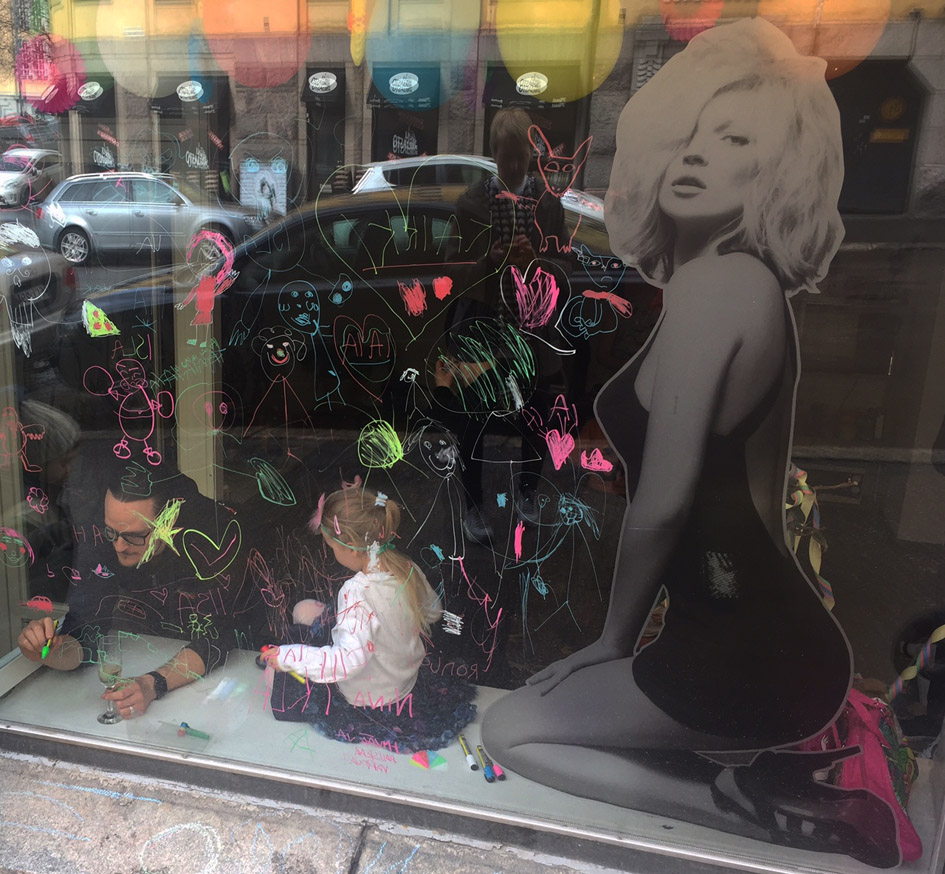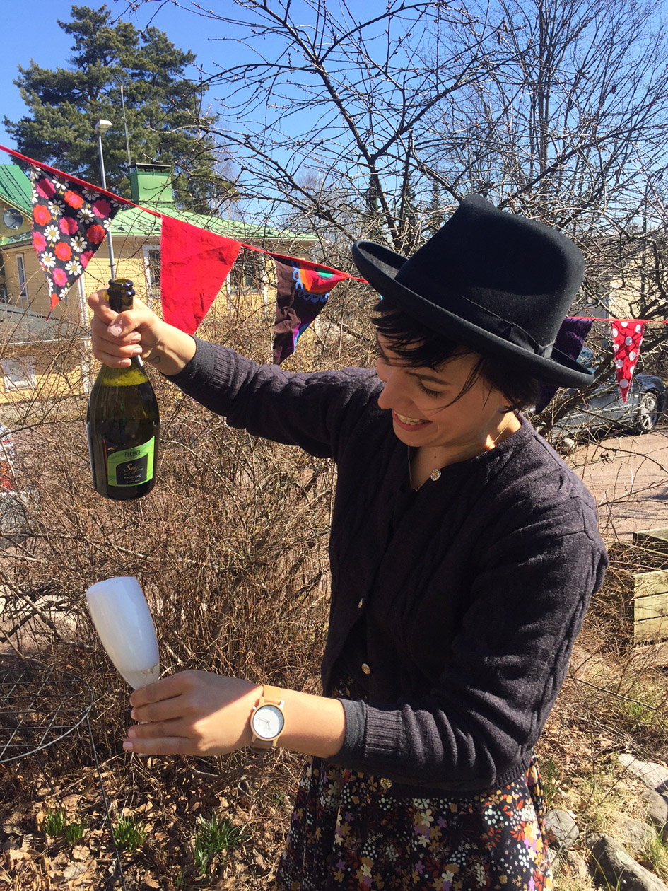 Itse vedin vapun tänä vuonna melko helpon kautta, koska en vaan jaksanut ja ehtinyt säätää. Työhuoneelle tuotiin nyyttärihengessä tarjottavia, lapset piirtelivät toimiston ikkunaan ikkunatusseilla, puhaltelivat saippuakuplia Flemarilla (aina niissä väleissä kun ei satanut lunta!). Aikuiset antoivat jälkikasvulle melko vapaat kädet ja keskityimme vaihtamaan kuulumisia ja nauttimaan kuohuviiniä, sen verran kun nyt lasten seurassa voi (turha moralisoida postauksen perään, minusta aikuinen voi nauttia 1-2 lasillista alkoholia lasten läsnäollessa).
