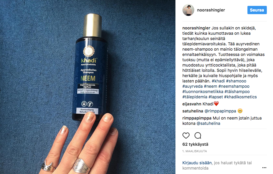 - Khadin NEEM-hilseshampoo puolestaan on se, josta vinkkasin somessa aikaisemmin keväällä: toimii luonnollisena täiden häätäjänä.