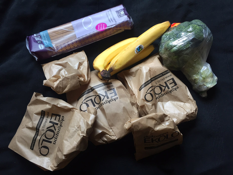 Onneksi tähän aikaan vuodesta torit palvelevat ja kaupat kuten Ekolo, josta saa isoimman osan hevistä mukaan paperipussissa ja muovitta. Harmillisen monet luomukasvikset kuitenkin muovitetaan, esimerkiksi parsakaali ja kurkku. Ne toki saa just nyt torilta muovitta, mutta sitten taas toisaalta ei jaksaisi juosta monessa eri paikassa tekemässä ruokaostoksia. Päädyin siis tänään Ekoloon, josta sain isoimman osan ruoasta paprussa, mutta sitten nuo muutamat muovit taas bonarina. Aargh.