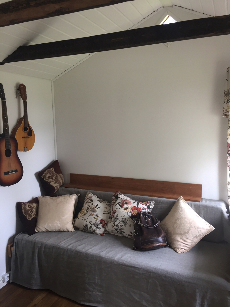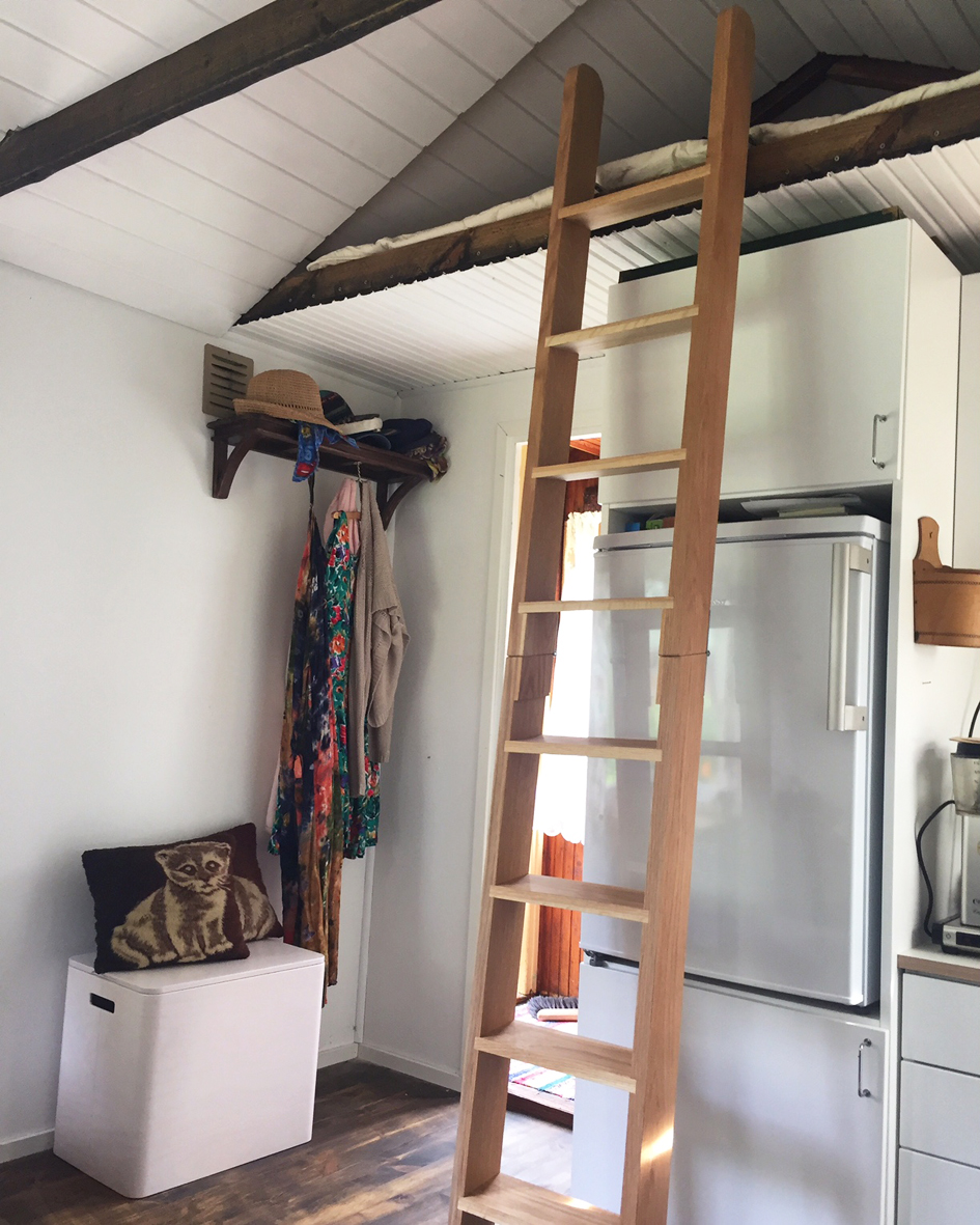 Lähituotantoa ovat myös mökin parvelle vievät tikkaat ja vastakkaisen seinän hylly. Tilasin ne salolaiselta ProtosDemos-kalustefirmalta. Yrityksen perustajapariskunta on vanhoja koulukavereitani ja tietenkin halusin mielummin tukea frendien bisnestä kuin marssia Ikeaan. Lasse-Markus lupasi ”legendaariset” tikkaat, ja ovat ne kyllä hemmetin hyvät: tukevat, nätit ja keskeltä kahtia taittuvat, mikä oli ihan must, että saan tikkaat säilytettyä mökissä.