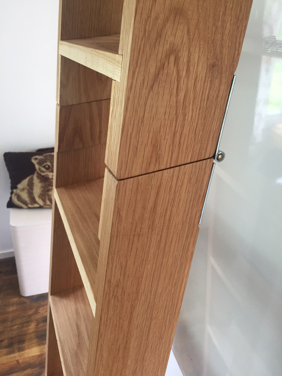 Sekä tikkaat että hylly ovat materiaaliltaan massiivitammea. Hylly on tosin vielä kiinnittämättä ja majailee sohvan selkänojan päällä, mutta eiköhän se kohta saada paikoilleen. Kuten sanoin: olen vähän hidas näissä hommissa.