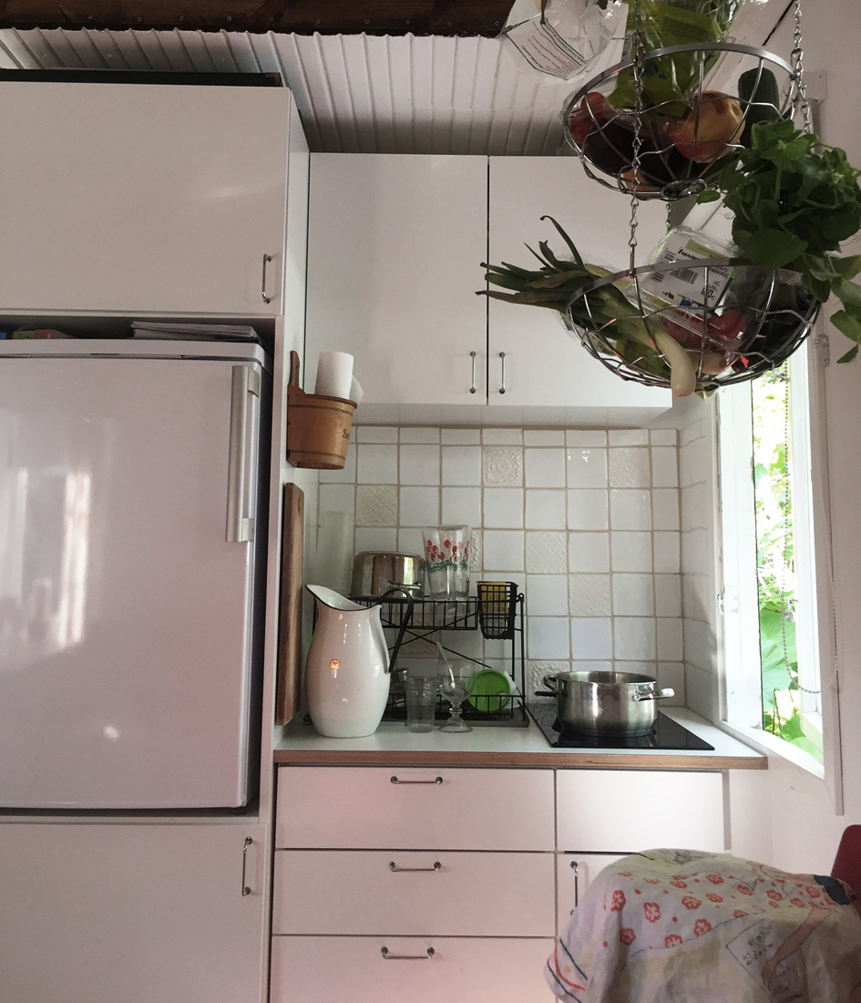 Viime vuonna keväällä aloitettu pienen kesämökkini remontti on edennyt taas roimasti, kun olen saanut vihdoinkin möksälle kaakelit seinään, tikkaat parvelle, kirjahyllyn ja uuden säilytysjärjestelmän. (Miten voikin olla hidasta edistää 10 neliömetrin kokoisen mökin remppaa? En ikimaailmassa pystyisi omistamaan tätä isompaa puutaloa. 10 neliömetriä on just hyvä.)