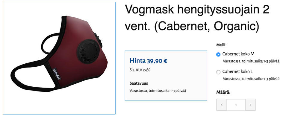 Vielä Vogmaskista: verkkokaupassa on erilaisia hengityssuojainmalleja, joita on luokassa FFP1 ja FFP2. Kevyempi FFP1- hengityssuojain suodattaa 80 %, kun taas FFP2-luokan hengityssuojain suodattaa jopa 95 % ilmansaasteista. FFP2-hengityssuojain soveltuukin erityisherkille ja heille, jotka altistuvat voimakkaasti ilmansaasteille päivittäin. Huomioi myös, että Vogmask-hengityssuojaimet eivät sovellu ammattikäyttöön, vaan ne on tarkoitettu tavallisten ihmisten arkea helpottamaan.