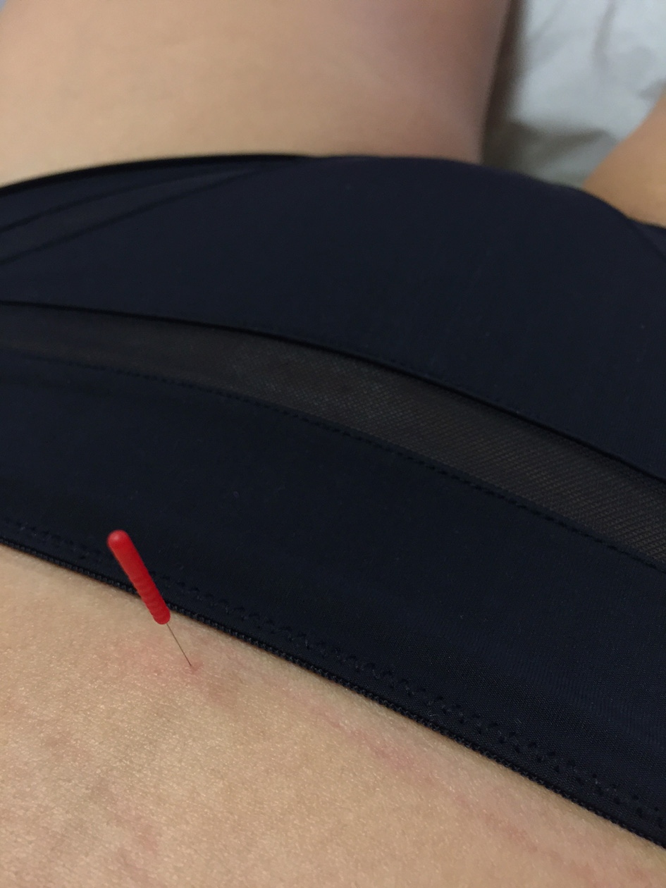 Seuraavaksi oli akupunktion vuoro. Neuloja laitettiin alavatsaan, kämmenselkiin, sääriin, pohkeisiin ja nilkkoihin. Taina aktivoi neuloilla pisteitä, jotka vaikuttavat mm. veren muodostumiseen ja säätelevät kuukautiskiertoa.